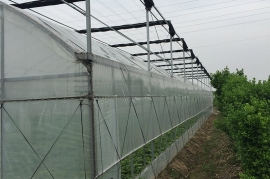 該產品由基礎、框架立柱,頂部拱管三大部分組成。點式獨立基礎,使大棚根基牢固;立柱采用熱鍍鋅方管,大大增強抗風抗雪強度;頂部由熱浸鍍鋅鋼管排列成平滑圓弧形,牢固兼美觀。同時天溝采用2mm厚熱鍍鋅板冷彎成型,容量大,排水及時;頂部天溝處和大棚四周均設置搖膜通風系統(tǒng),是大棚內部氣流通暢。此產品可根據(jù)需要實現(xiàn)相關配套設施,以便達到更理想的效果,如外遮陽系統(tǒng)、內遮陽保溫系統(tǒng)、降溫系統(tǒng)、加溫系統(tǒng)、噴滴灌系統(tǒng)等。