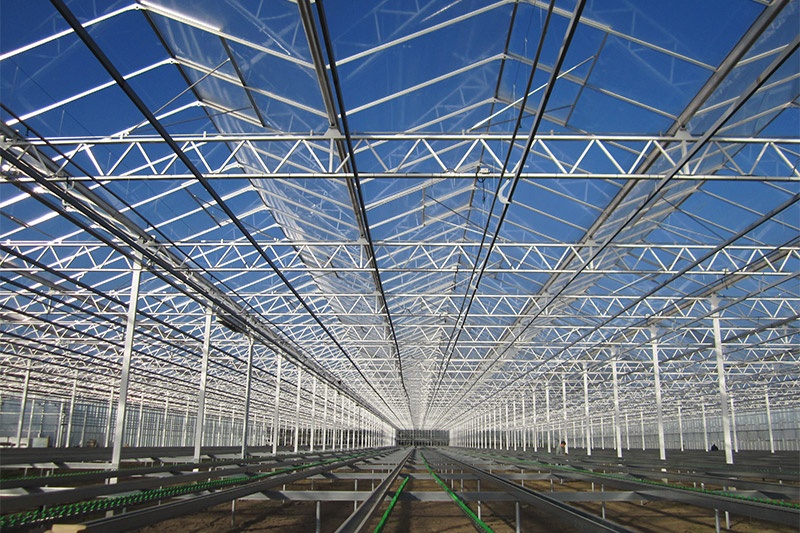 文洛式玻璃溫室為一跨三尖頂、雙坡面小屋頂桁架結構、多雨槽、具有美觀、吊掛能力強、透光性好、空間大、機械性能強等優點。